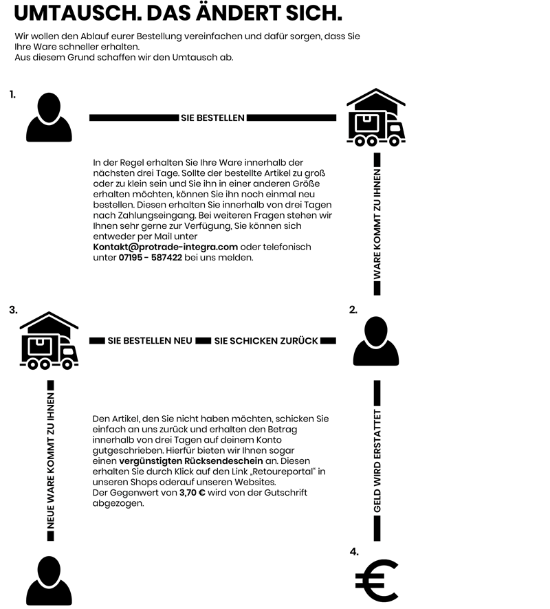 Zukünftig werden zurückgesendete Waren pauschal zurückerstattet, statt diese umzutauschen. Sollte ein Umtausch in eine andere Größe gewünscht sein, so muss diese erneut über den Onlineshop bestellt und bezahlt werden.